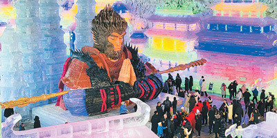r游客在悟空造型冰雕前打卡游玩。 尹星云摄